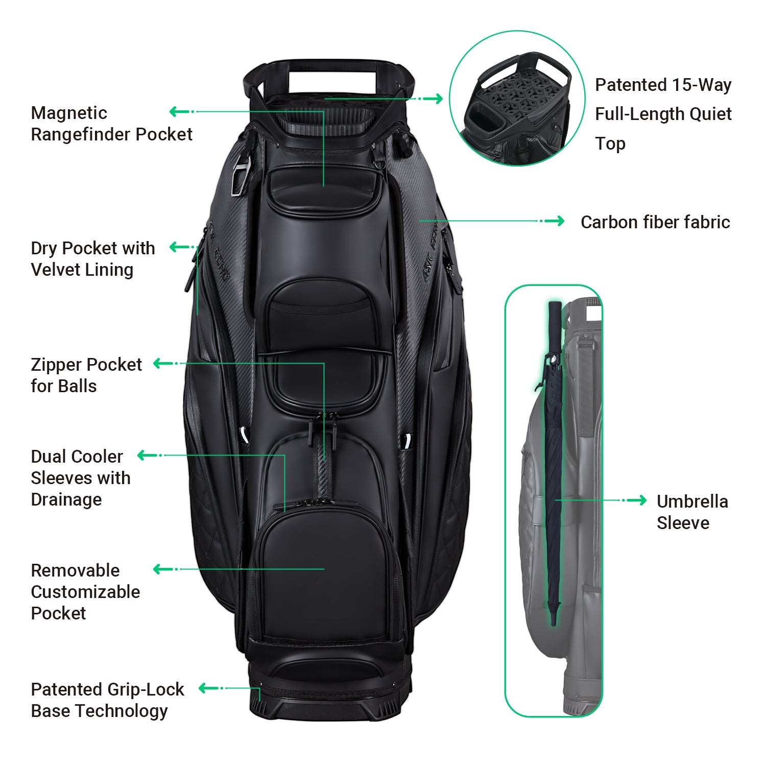 Latest 15-way molded organization top with an over-sized putter well & full-length dividers ensure each club has own VIP seat & well organized.